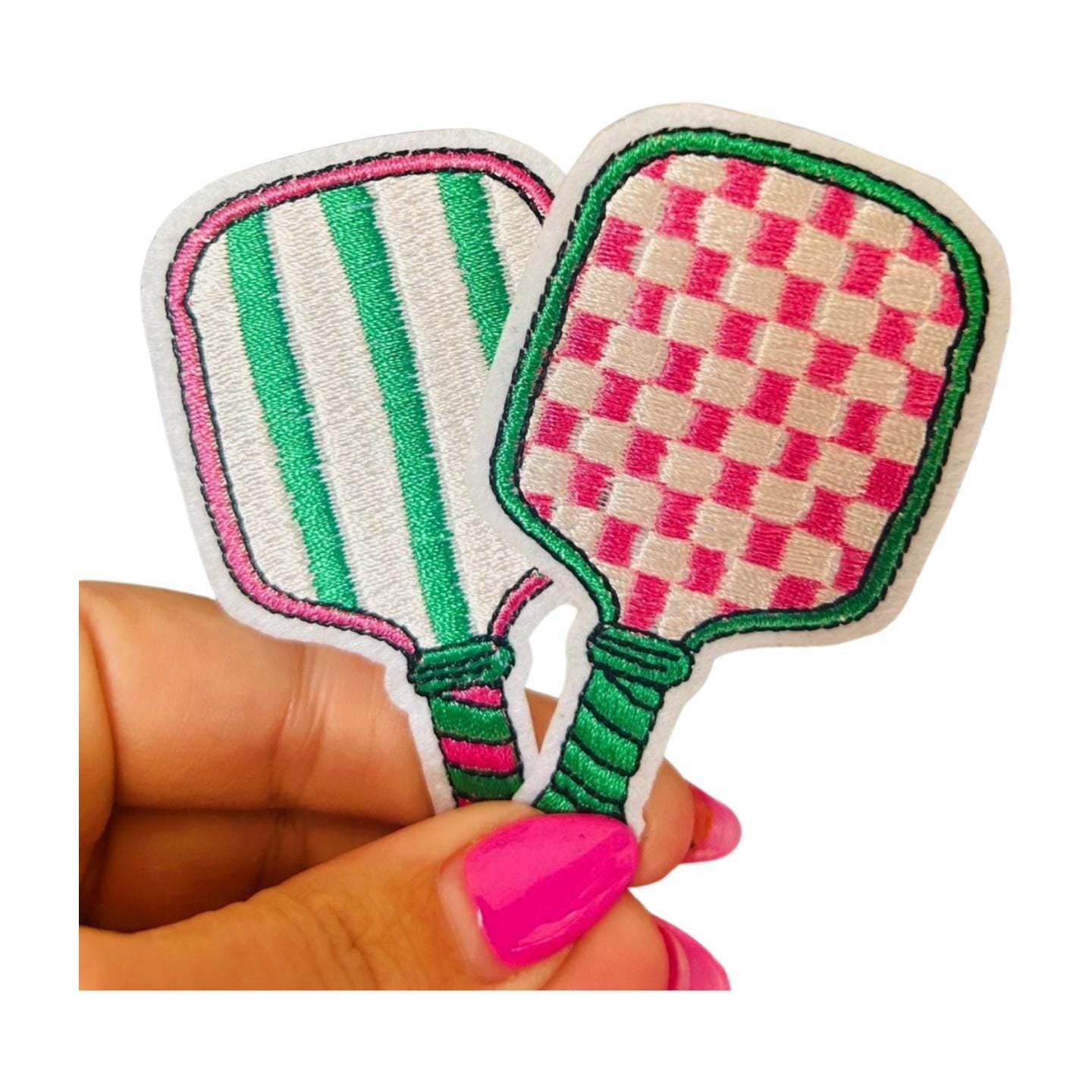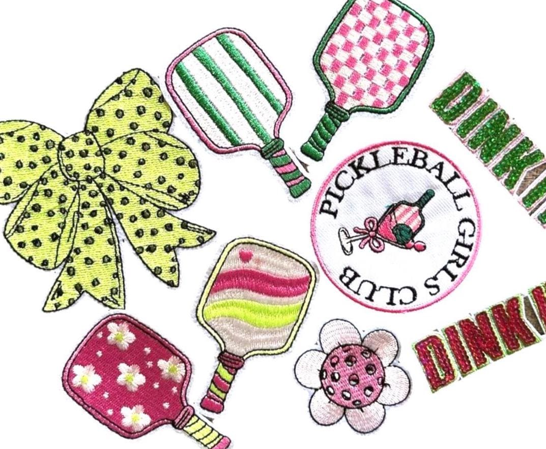 Add a stylish touch to your clothing or hats with this pickleball iron-on patch bundle featuring a striking white, pink, and green designs that makes the perfect team present or player gift. This pickleball paddle patch, pickleball girls club, pickleball ball flower patch, and Dink It iron on patch are the perfect addition to any accessory.